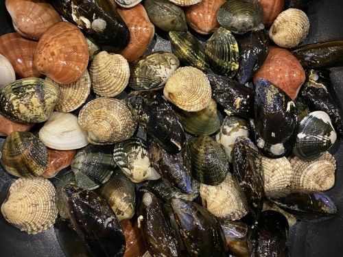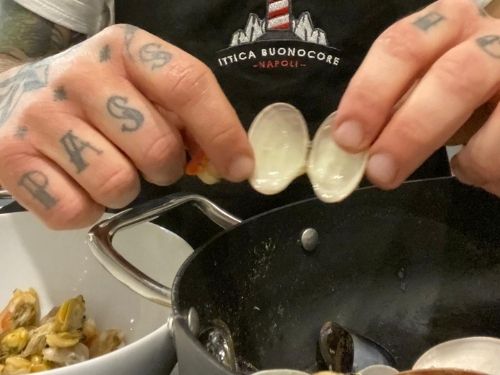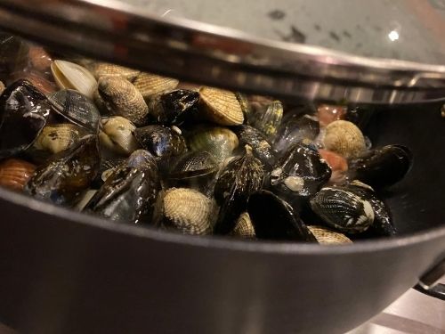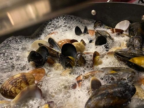 Once the seafood is cooked, take it to a sealed container. In the same pan, add the shellfish to let them open up. As soon as they do, move on to the next step: remove the meat from the shells, leaving a few whole for decoration. Be careful here: do not discard the liquid released by the shellfish, strain it and set it aside on another container (we will use it later to cook the rice).