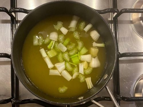 Once all the ingredients are ready, start with the vegetable broth: this must be homemade. For every liter of water add celery, carrots, one onion and salt to taste. Let it gently simmer.