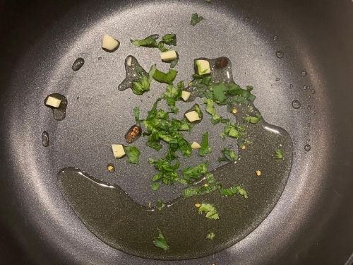 Prepare a pan with extra virgin olive oil and a clove of garlic. Let it sizzle for a few seconds and add finely chopped chili and parsley for a truly spectacular soffritto. After a couple of minutes, add the seafood (shrimp and squid) and pour in some white wine to deglaze.