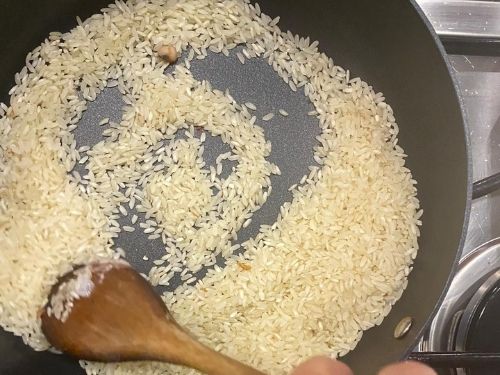 Place the seafood into a third sealed container and, in the same pan, toast the rice. When it turns golden, pour in a splash of white wine to deglaze again. Once the wine has evaporated, gradually add vegetable broth and the reserved shellfish liquid.
