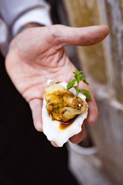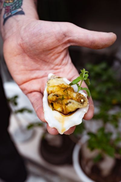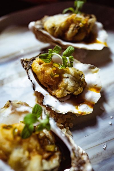 To serve, place each fried oyster back into its shell, using it as a natural serving vessel, and drizzle with the dressing.