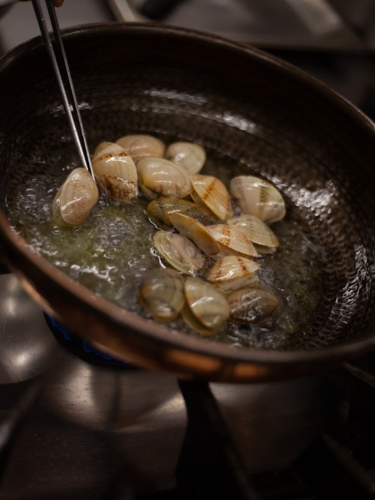 2. aggiungi il pane panko, il limone candito e le 12 vongole col guscio;